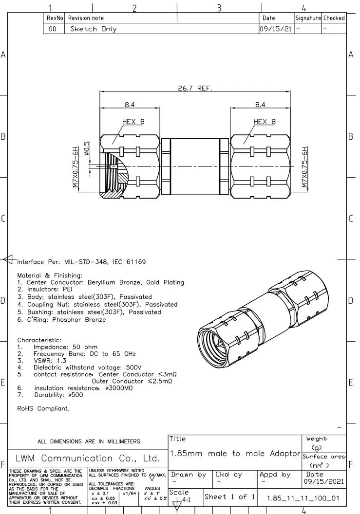 मिलीमीटर वेव परीक्षण प्रणालियों के लिए डीसी-65 गीगाहर्ट्ज़ 1.85 मिमी पुरुष से पुरुष परिशुद्धता एडेप्टर