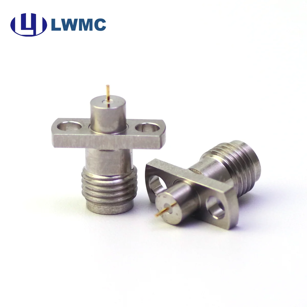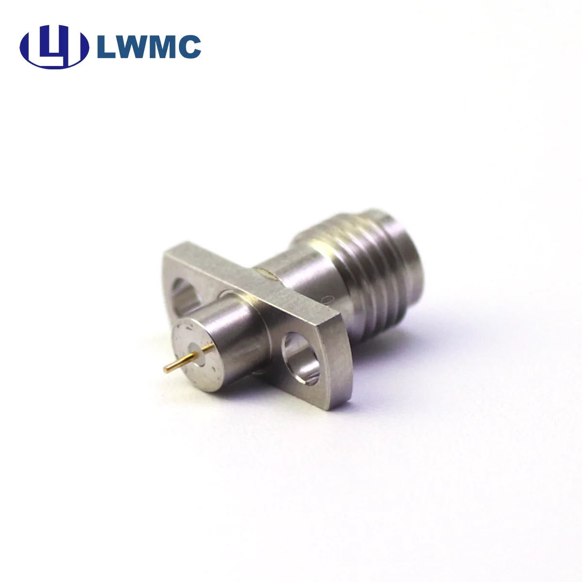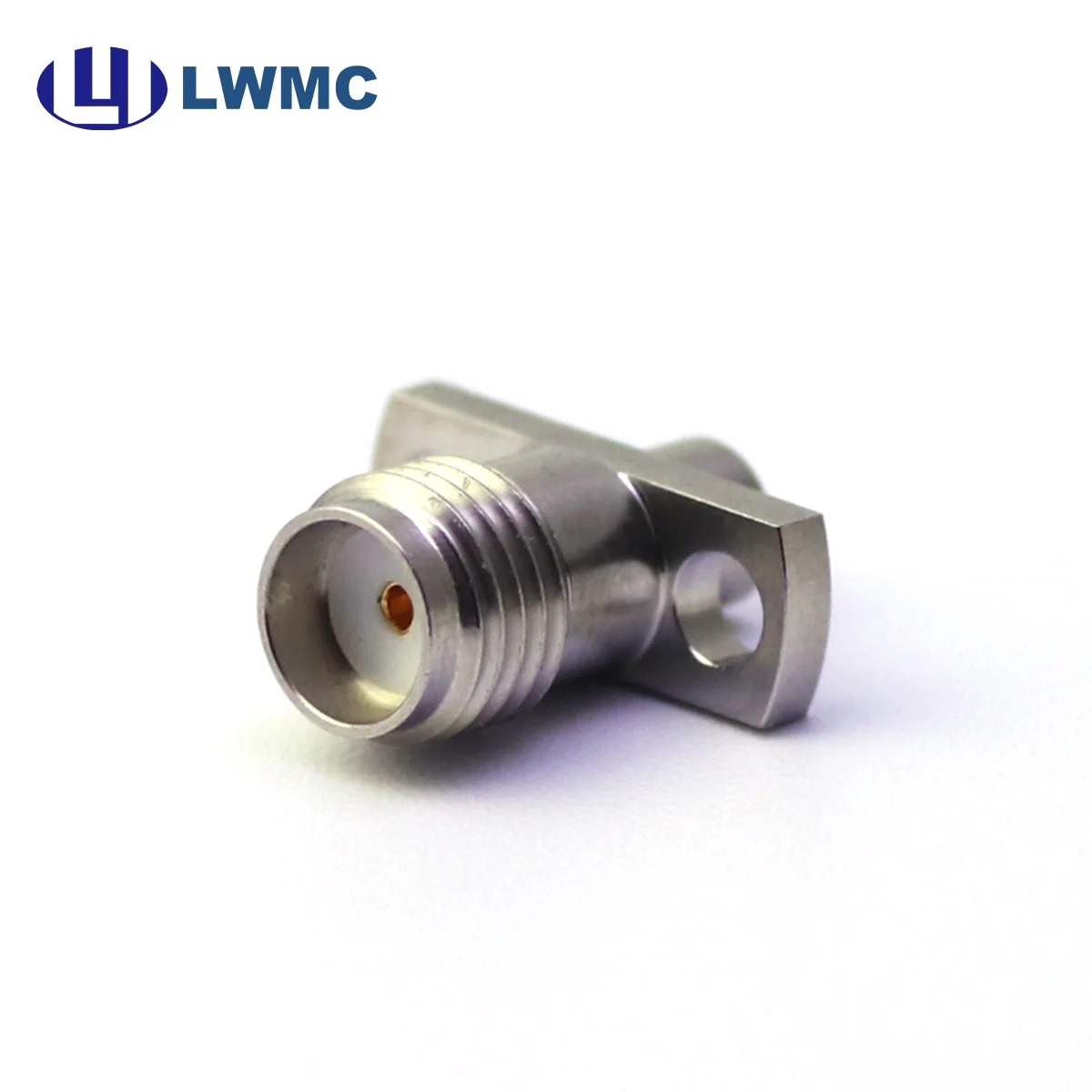 ขั้วต่อแบบ SMA ชนิดหญิง ติดตั้งบนแผงหน้า (Panel Mount) พร้อมฟลานจ์สี่เหลี่ยมผืนผ้าแบบมีรูยึด 2 รู ความต้านทาน 50 โอห์ม ช่วงความถี่ DC–26.5 GHz สำหรับการเชื่อมต่อ RF ที่มั่นคง